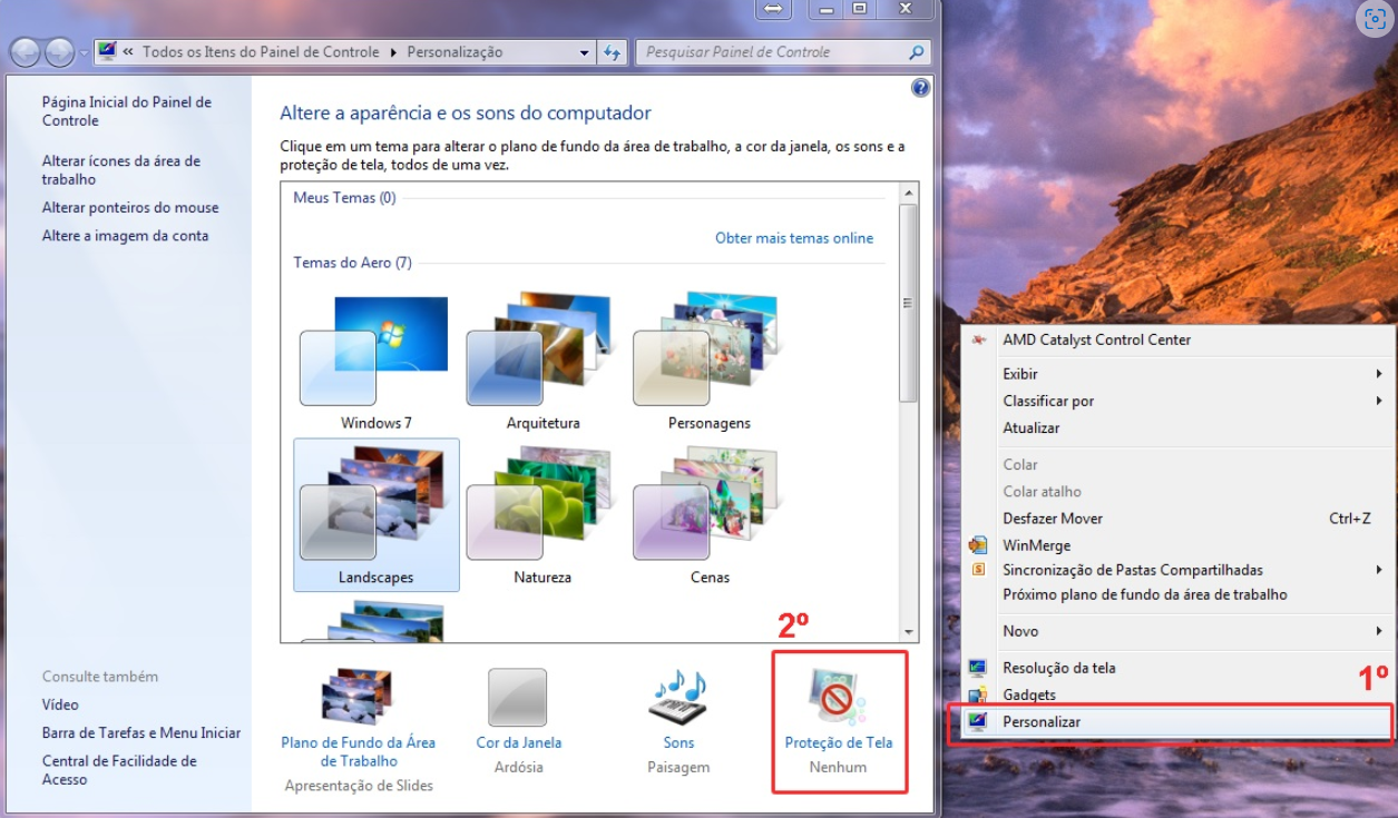 1º – Na área de trabalho do Windows clique em Personalizar ou Propriedades