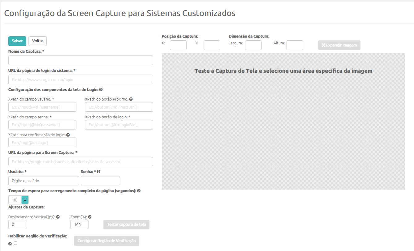 Após inserir todos os dados necessários, será exibido o botão ‘Testar captura de tela‘. Ao clicar neste botão, será disponibilizada a captura de tela para selecionar a posição e a dimensão do corte da imagem. Também é possível expandir a imagem (ver botão disponível acima da imagem capturada) para selecionar melhor a seleção da captura.