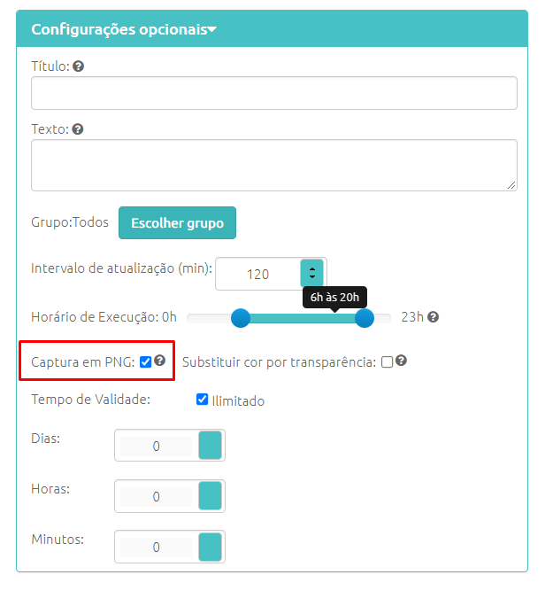 Para habilitar a opção PNG e substitui-la por transparência é necessário acessar as configurações opcionais da captura.